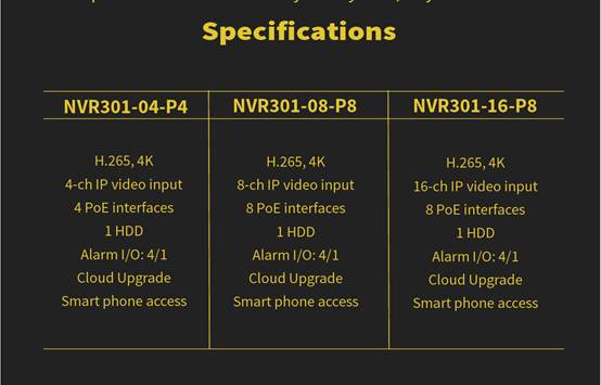 NVR301-P has 4 or 8 PoE interfaces. Don’t need to make configuration, just plug and play.