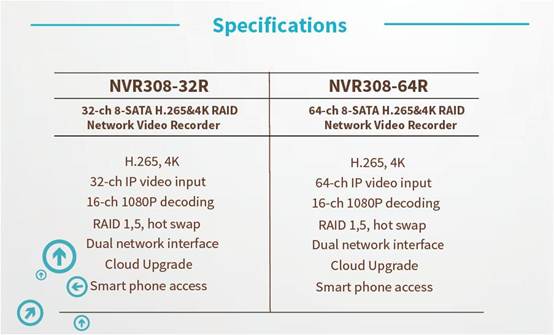 We recently released new H.265&4K RAID NVR, whose model name are NVR308-32R/64R. Featured by H.265 and 4K both, and 16ch 1080P real time decoding ability, it can help you to upgrade your video surveillance system easily. RAID and HDD hot swap help you build a more reliable surveillance system.