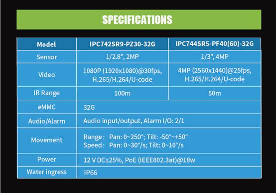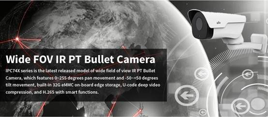 IPC74X series is the latest released model of wide field of view IR PT Bullet Camera, which features 0~255 degrees pan movement and -50~+50 degrees tilt movement, built-in 32G eMMC on-board edge storage, U-code deep video compression, and H.265 with smart functions.