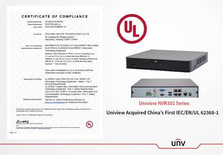 Recently, UL, the global independent safety science company issued Uniview NVR301 Series products with the first IEC/EN/UL 62368-1 Certificate in China. IEC/EN/UL 62368-1 is the state of the art safety standard for computer, communication and audio/video devices. It brought in HBSE (Hazard-Based Safety Engineering), putting up more precise issues for protecting personal safety. Uniview worked closely with UL, tests, verifies, and validates NVR301 Series strictly under the standards of IEC/EN/UL 62368-1, ensured safer and higher quality products for users.