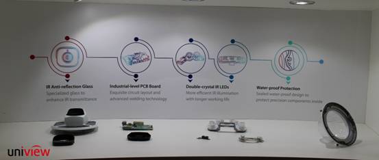 At IFSEC, Uniview dismantled cameras and NVRs to show the precise designs inside: IR anti-reflection glass used in PTZ dome and bullet cameras can increase 7% IR transmittance. Double-crystal IR LEDs embedded inside IPC212x series bullet and IPC323x series fixed dome can produce better image while using only 2 IR LEDs. Uniview selected and chosed third generation car-grade LEDs, the IR light can reach up to 30 meters. Unique sealed water-proof design used in IPC323x series fixed domes enables the dome with IP66 protection. Uniview also showed its industrial-level PCB board in NVR, completely demonstrated that Uniview has the ability to manufacture high quality and reliable products.